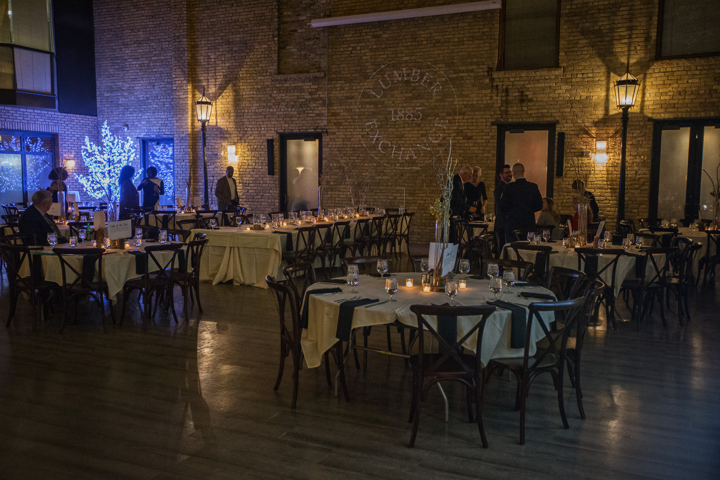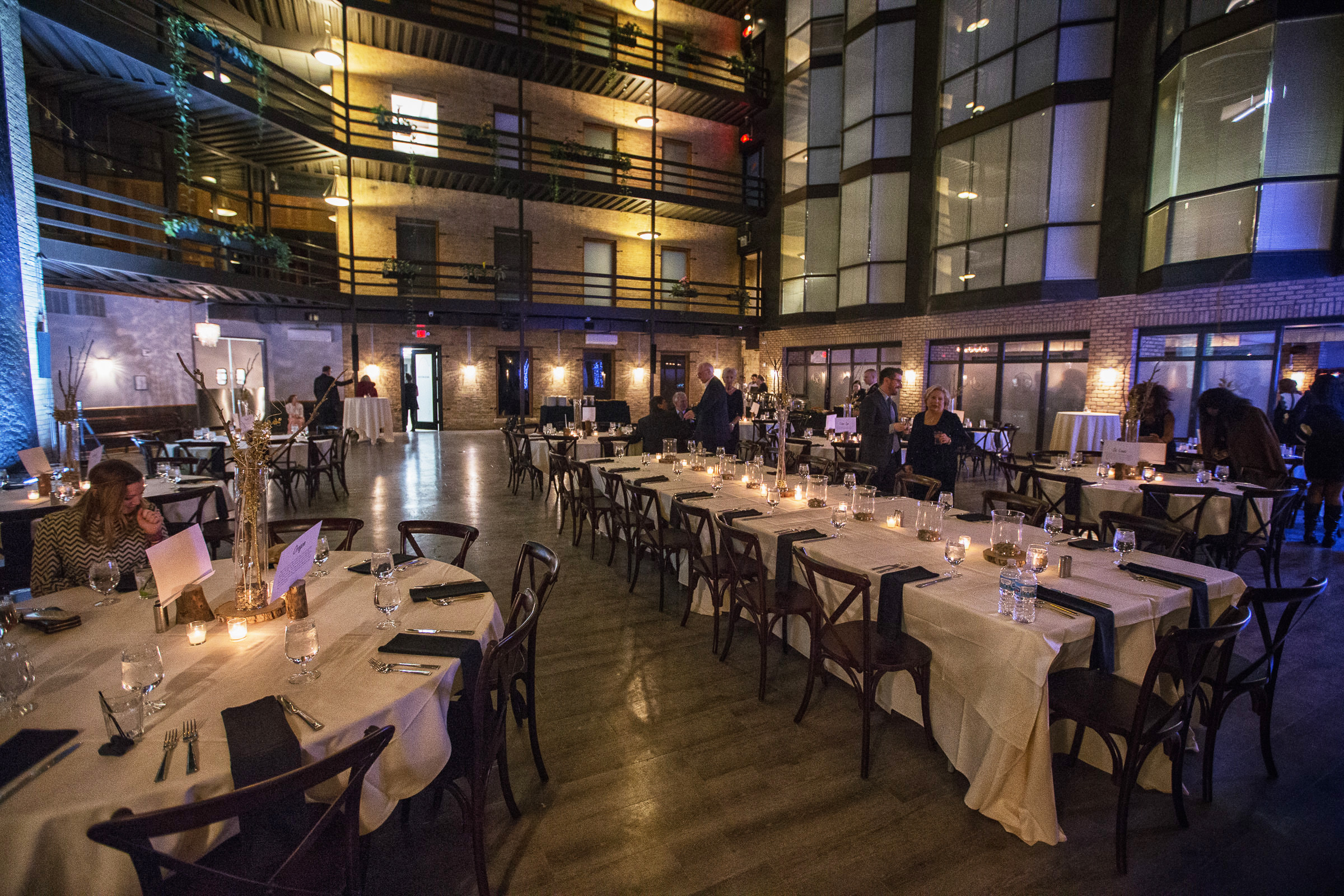The Fountain Room is a stunning, nine story atrium filled with natural light and rustic grandeur. At the entrance of the space, soaring fountain trickles down an exposed brick wall. Glittery chandeliers & sconces and repositioned vintage lamp posts create a warm ambiance in The Fountain Room. Perfect for weddings and receptions, as well as galas and social functions alike, this space seats 250 guests for any dinner, or accommodates up to 350 guests for any cocktail reception. The Fountain Room and River Room combined can accommodate up to 385 guests for any dinner or 585 guests for a large standing-only event.